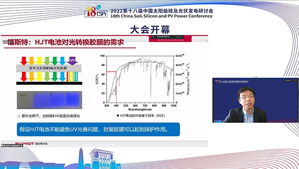 2022年12月8日至10日,第十八屆中國(guó)太陽(yáng)級(jí)硅及光伏發(fā)電研討會(huì)(18th CSPV)在山西太原舉行。本次會(huì)議采取線上論壇的形式召開,福斯特等光伏企業(yè)協(xié)辦。在會(huì)議首日主會(huì)場(chǎng)論壇中,福斯特總經(jīng)理周光大博士針對(duì)光伏市場(chǎng)主流的新電池技術(shù)闡述了福斯特的理解,提出了專業(yè)的解決方案,并做了題為《新型高效電池的封裝方案》的報(bào)告。