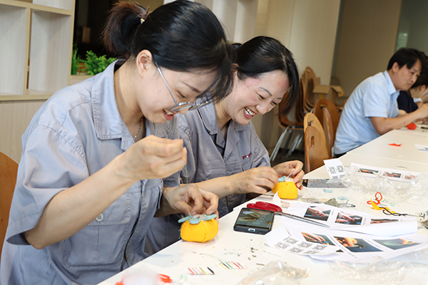 萋萋苦艾納香囊,傳承千年未泯香。我國(guó)自古就有端午佩戴香囊的傳統(tǒng),清香的艾葉有避邪驅(qū)瘟、醒腦提神的功效,也有“招百?!钡拿篮迷⒁狻T工們自己動(dòng)手縫制柿子形狀的香囊,象征“柿柿如意”,大家全神貫注,穿線、縫制、收口、定型,一個(gè)個(gè)可愛的小柿子就在手中誕生了。