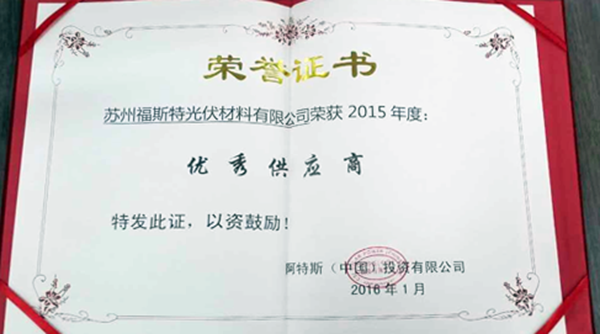 2016年開年之際,福斯特再獲佳績。1月20日,蘇州福斯特光伏材料有限公司應(yīng)邀參加阿特斯年度供應(yīng)商頒獎活動,并榮獲阿特斯2015年度優(yōu)秀供應(yīng)商。