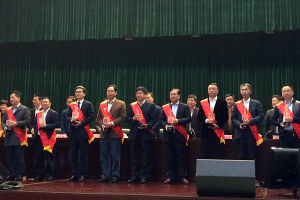 福斯特董事長林建華(左三)被評為臨安市“十二五”杰出貢獻企業(yè)家并接受大會表彰