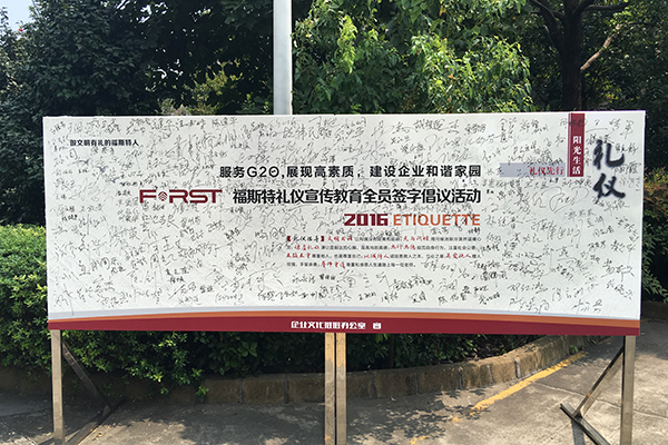 福斯特積極打造健康、和諧、生動(dòng)的企業(yè)文化,以文化活動(dòng)為載體,豐富員工精神生活,展現(xiàn)企業(yè)活力風(fēng)采。由福斯特企業(yè)文化辦公室主辦的福斯特禮儀宣傳教育季活動(dòng)在G2O期間在全公司開(kāi)展,以“陽(yáng)光生活,禮儀先行”為主題,內(nèi)容包括開(kāi)設(shè)全員培訓(xùn)課程、開(kāi)展全員簽字倡議活動(dòng)活動(dòng)、學(xué)習(xí)福斯特《禮儀手冊(cè)》,后續(xù)還將陸續(xù)開(kāi)展禮儀征文活動(dòng),禮儀知識(shí)問(wèn)答和禮儀行為調(diào)查活動(dòng),在全公司營(yíng)造濃厚的“禮儀文化”氛圍,號(hào)召大家共同做文明有禮的福斯特人,展現(xiàn)良好的企業(yè)禮儀風(fēng)貌迎接G20峰會(huì)到來(lái)。